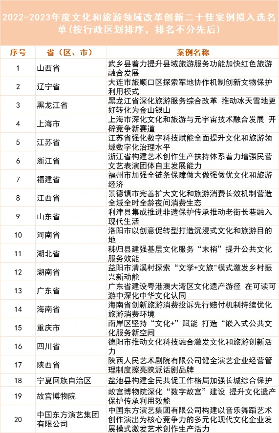 近日,文旅部发布《关于2022—2023年度文化和旅游领域改革创新典型案例名单的公示》,文章公布了20佳案例名单以及38个优秀案例名单,下面为公示的详细内容。