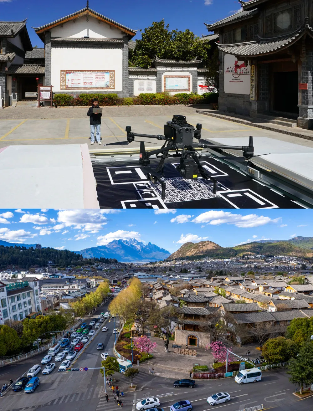 上图为工作人员通过电脑操作无人机准备在丽江古城内进行巡视;下图为无人机视角下拍摄的丽江古城一景。新华社记者 陈欣波 摄